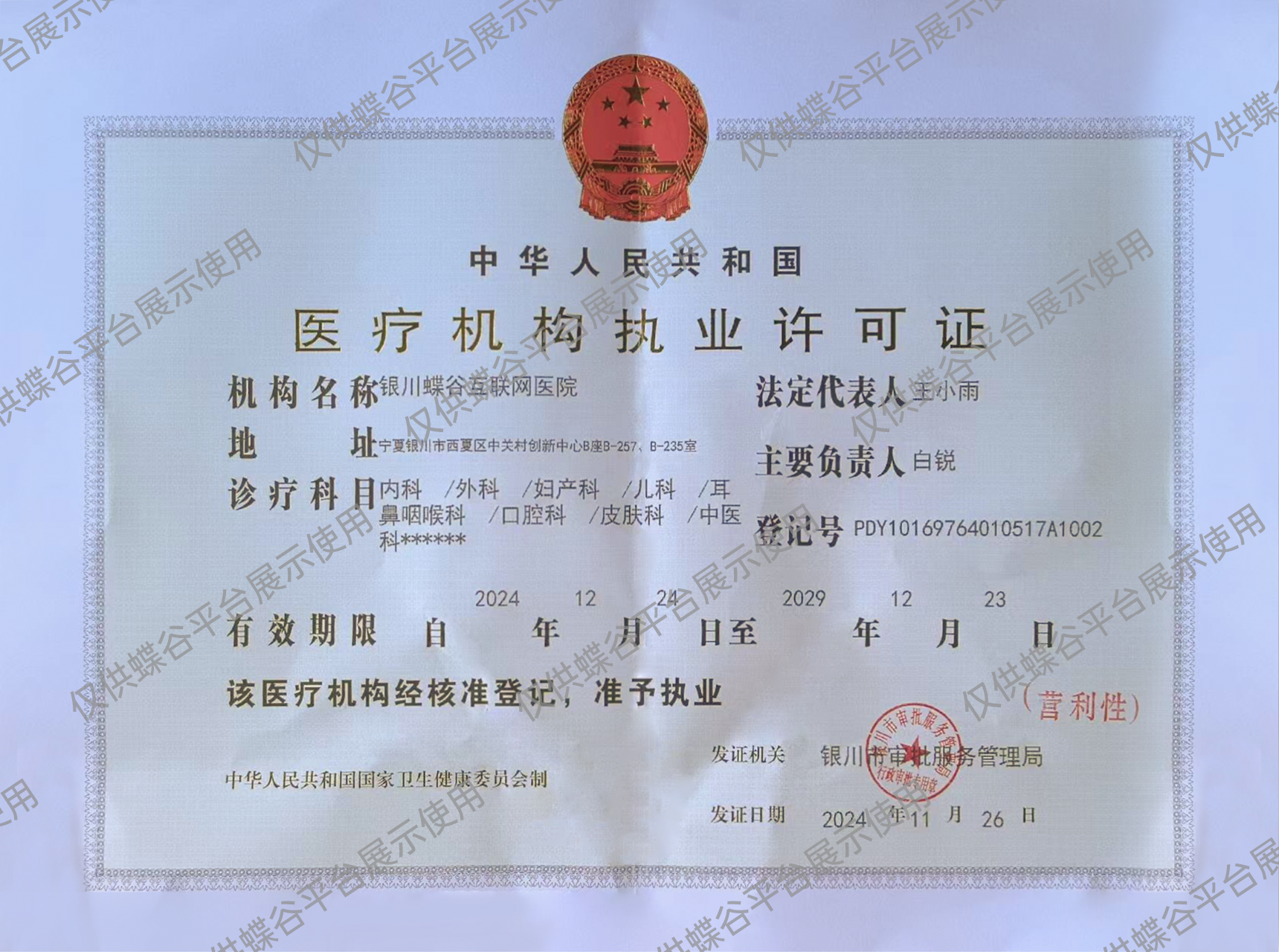 银川蝶谷互联网医院成立于2019年,隶属于医加壹集团,注册资金1000万,同年根据国务院关于开展互联网诊疗的管理办法,依托国家互联网+医疗示范区银川市相关政策,正式获得《医疗机构执业许可证》,在全国范围内开设内科、外科、妇产科、儿科、中医科、皮肤科、口腔科、耳鼻咽喉科等科室的互联网医疗服务。